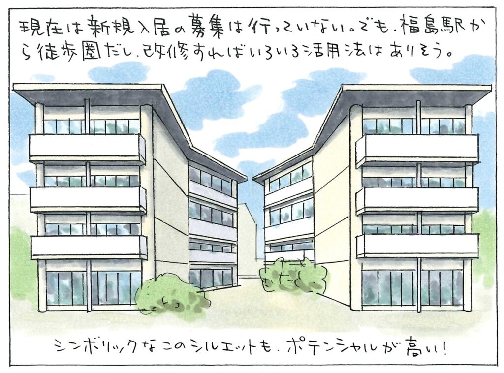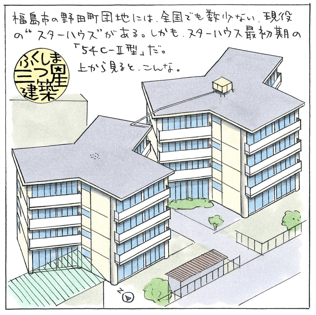 筆者は、福島県の建築サイト「ふくしま建築探訪」で県営野田町団地のスターハウスをイラストでリポートした。取材したのは今年の8月。初期のスターハウス(54C-2型)があると知り、自分から取材を希望したのだが、これを書いたときには、こんな再生事業が計画されていることは全く知らなかった(本当です)。