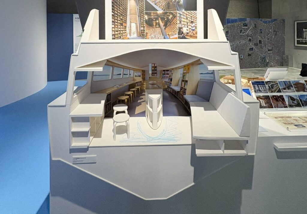 筆者がほんのもり号を知ったのは、今年3月19日に大阪で行われた「安藤忠雄展|青春」の内覧会(こちらの記事)でだった。瀬戸内海を航行するこの船の模型↓である。