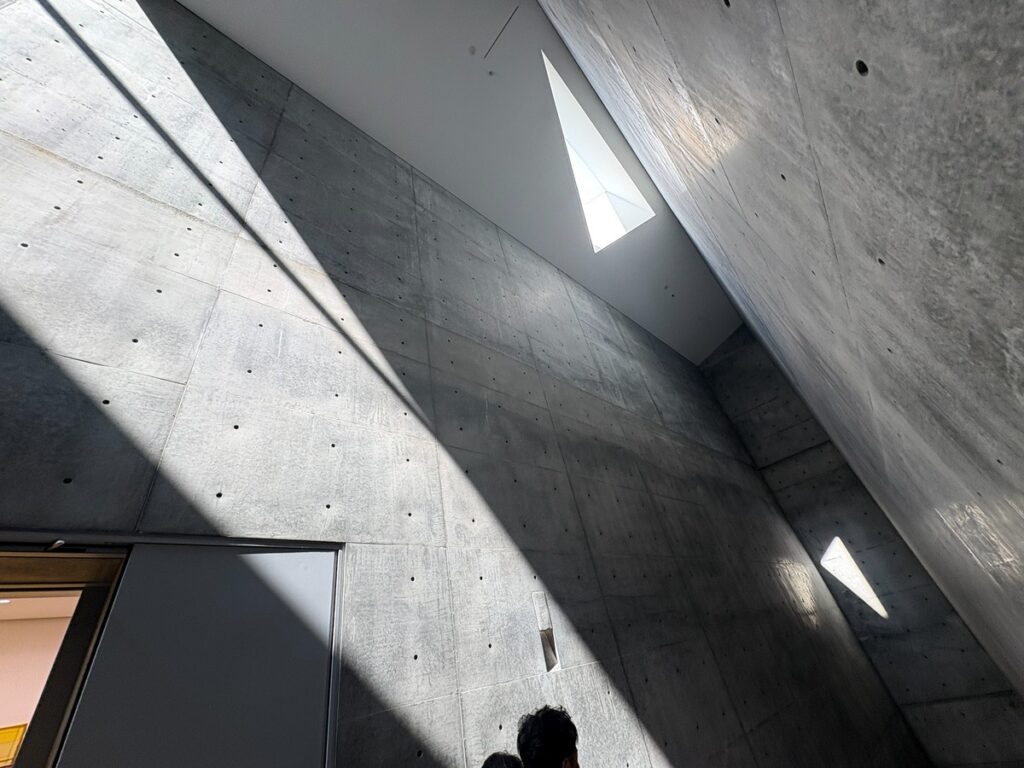 上部からコンクリートの壁をなめるように差し込む強い光。この日の好天を、建築の神に感謝!