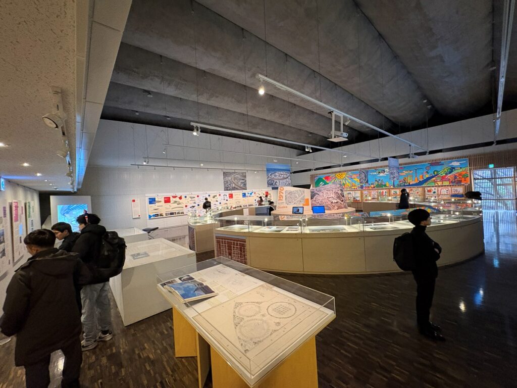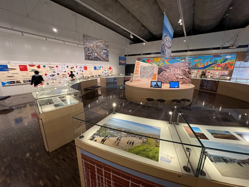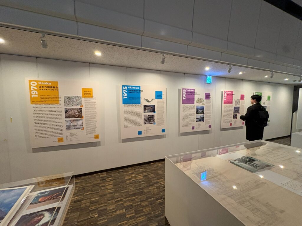 2025年3月から8月にかけて、当館で開催した「日本の万国博覧会 1970-2005」では、大阪・関西万博以前に日本国内で開催された5回の万国博覧会―日本万国博覧会(大阪万博、EXPO’70、1970年)、沖縄国際海洋博覧会(1975年)、国際科学技術博覧会(1985年)、国際花と緑の博覧会(1990年)、日本国際博覧会 愛・地球博(2005年)―に関して、当館が所蔵する図面や企画段階の資料を中心とした展示を行いました。セクションⅠでは、同展での各万博の解説パネルおよび案内図・航空写真(中央の円形展示台)、図面の一部を再展示します。