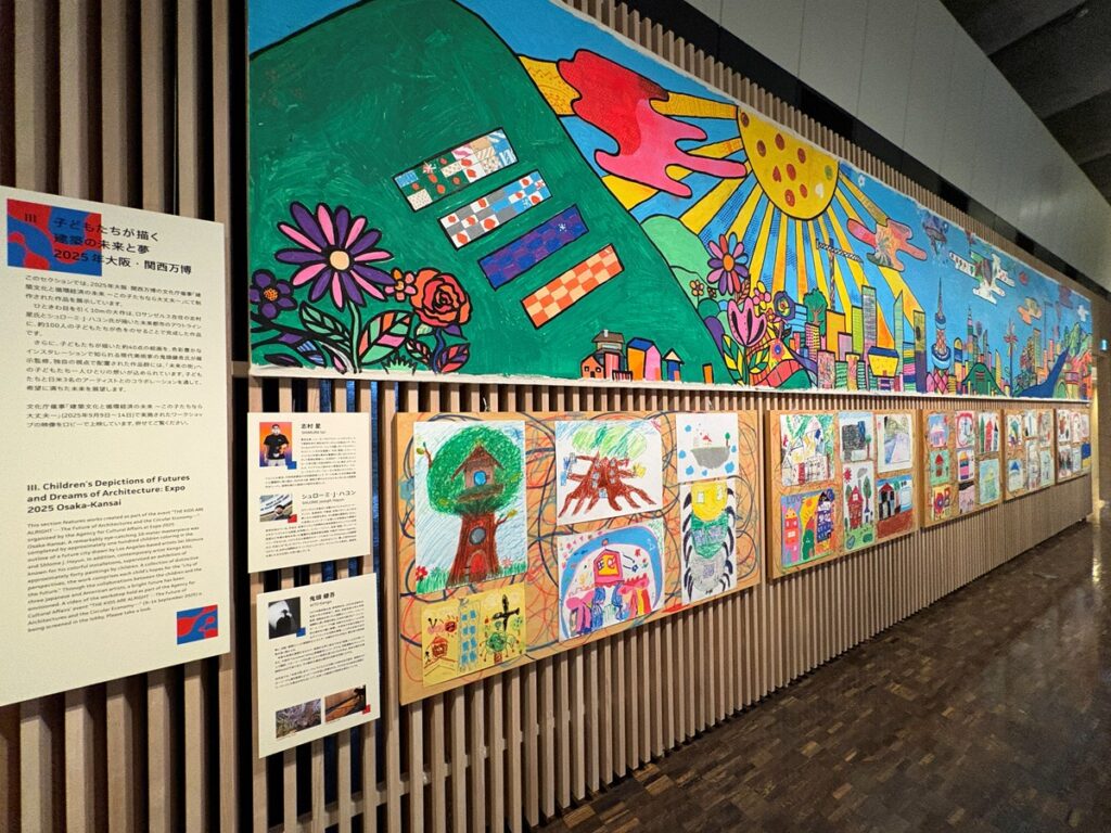セクションⅢでは、2025 年大阪・関西万博の文化庁催事「建築文化と循環経済の未来~この子たちなら大丈夫~」にて制作された作品を展示します。ひときわ目を引く10m の大作は、ロサンゼルス在住の志村星氏とシュローミ・J・ハユン氏が描いた未来都市のアウトラインに、約100人の子どもたちが色をのせることで完成した作品です。さらに、子どもたちが描いた約40点の絵画を、色彩豊かなインスタレーションで知られる現代美術家の鬼頭健吾が展示監修。独自の視点で配置された作品群には、「未来のプレス案内街」への子どもたち一人ひとりの想いが込められています。子どもたちと日米 3 名のアーティストとのコラボレーションを通して、希望に満ちた未来を展望します。