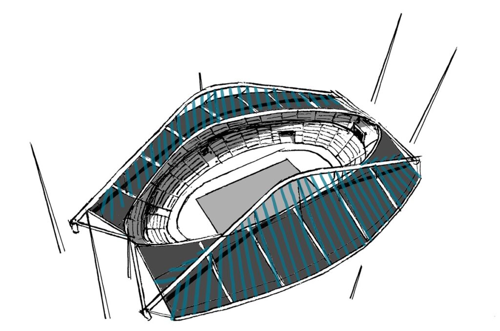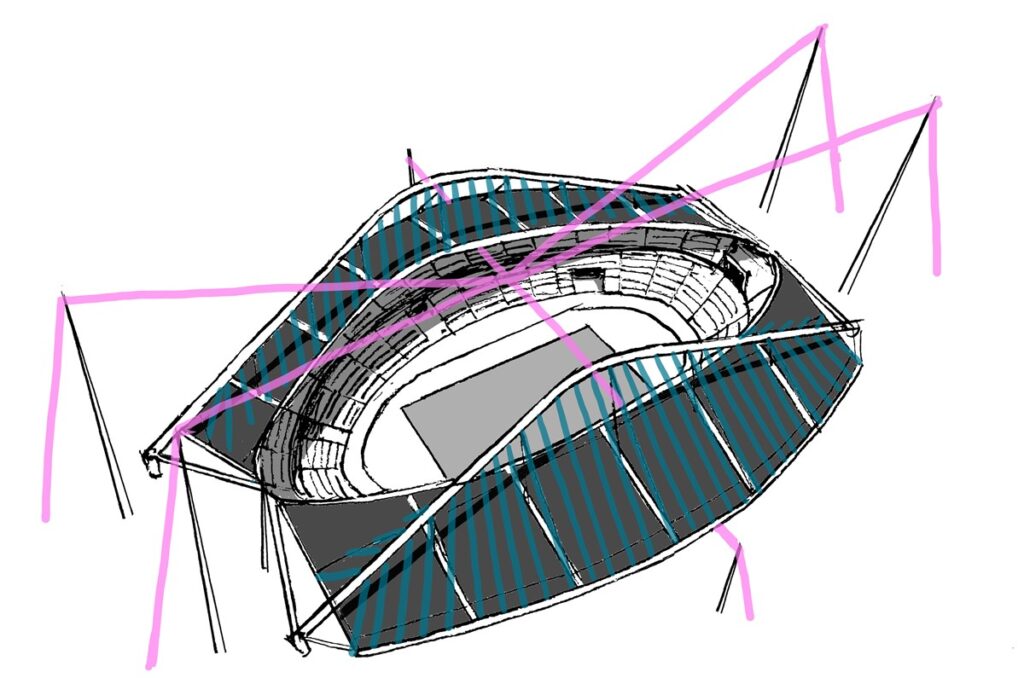 既存のスタジアムの上に2枚の屋根をくちびるのような形で浮かせ、それぞれの上に巨大な鉄骨アーチを架ける(イラスト:宮沢洋、以下も)