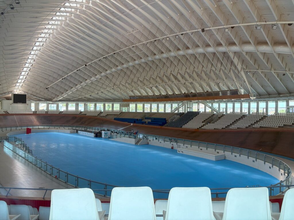 エリア内にもう1つ、兄弟のような小ぶりの吊り屋根ドームがあって、それがこの「オリンピック自転車競技場」。誰が見ても同じ設計者。