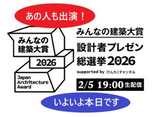「みんなの建築大賞2026」も投票期間のなか日となった。今回も投票の参考として、ノミネートされた10件の施設の設計者などによるライブ解説番組「設計者プレゼン総選挙」を開催する(オンライン配信)。開催は本日、2月5日(木 […]