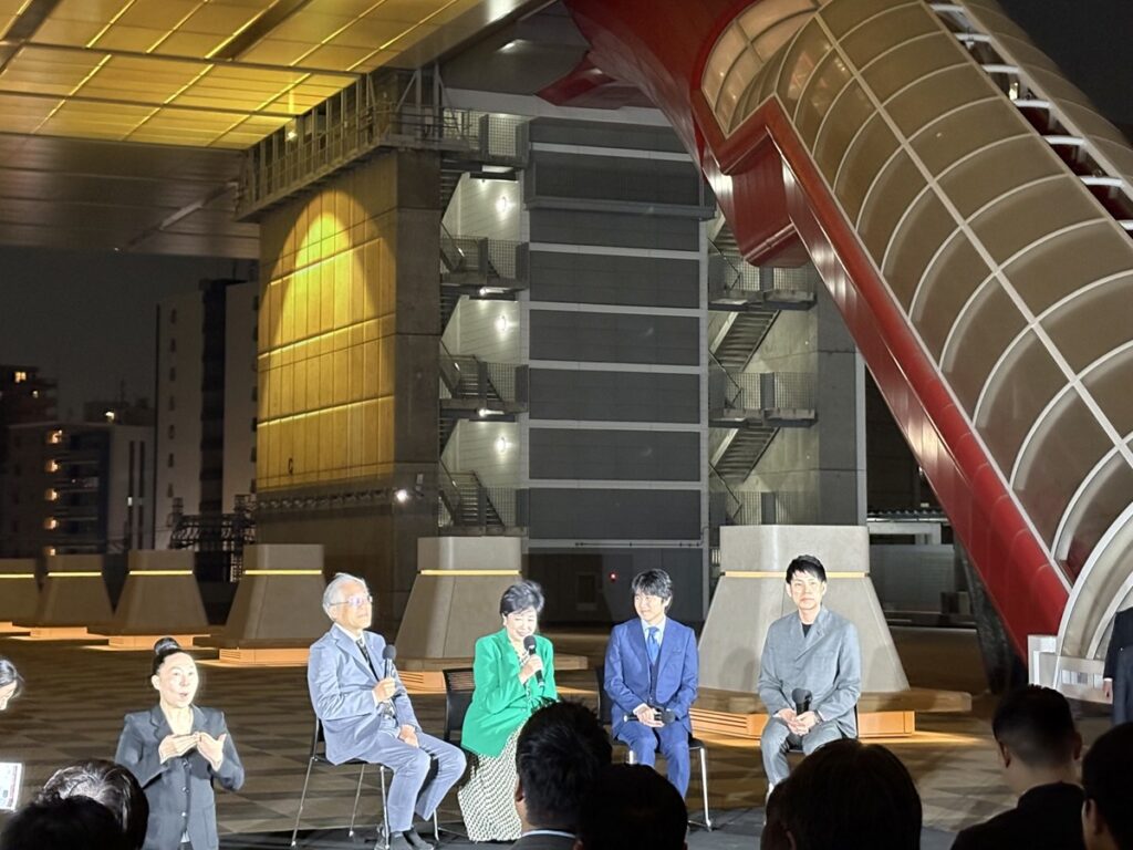 以下の動画は、点灯直前のカウントダウンから2分間ほどを撮影したもの。取材陣はたくさんいたが、こんなに引いた位置から取っている(建築好きな)人は他にいなかったので、たぶん貴重な映像。素人ゆえ、手ぶれはご容赦ください。