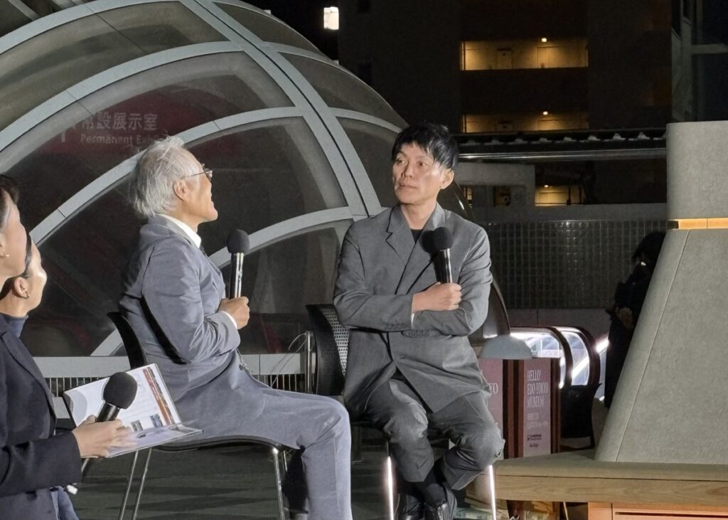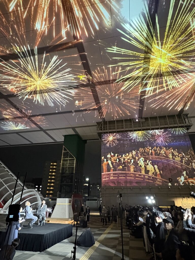 東京・両国の東京都江戸東京博物館(愛称:えどはく)が、3月31日にリニューアルオープンを迎えた。菊竹清訓氏(1928-2011年)の設計で1992年に竣工、93年3月に開館した同館を、OMAのパートナーである重松象平氏(1973年-)が空間デザインを監修する形でリニューアルした。その目玉である大天井への映像投影の点灯イベントが、開館前日の3月30日夜に行われた。