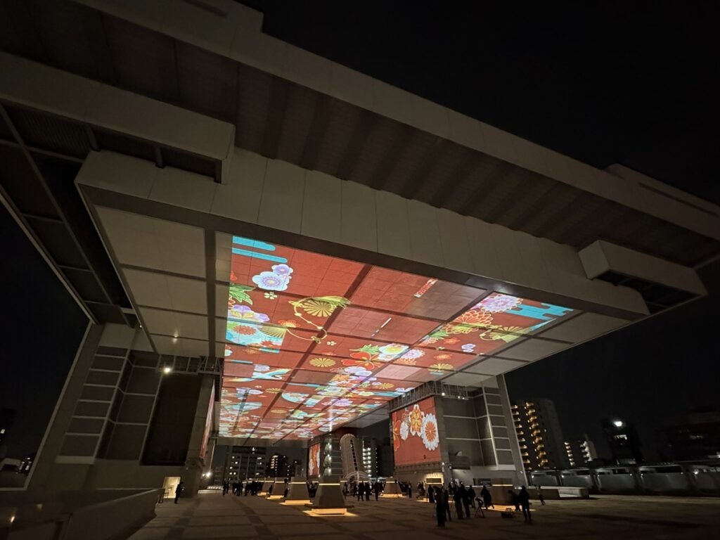 投影コンテンツの詳細やスケジュールはこちらへ。ざっくり言うと、当面は17:20~20:00にかけて、20分のプログラムが8回放映される(荒天の場合は中止)。江戸東京ひろばは入館料を払わなくても入ることができる。