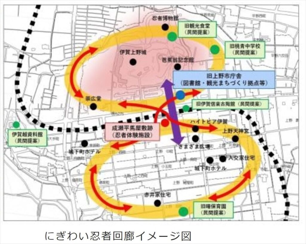 伊賀市は2020年にサウンディング型市場調査を実施し、その結果を受けてPFI事業に動き出した。2021年10月からPFI事業の提案募集を行った。それは庁舎活用とは結びつきにくい「伊賀市にぎわい忍者回廊整備(忍者体験施設等整備)に関するPFI事業」という事業の名称だった。