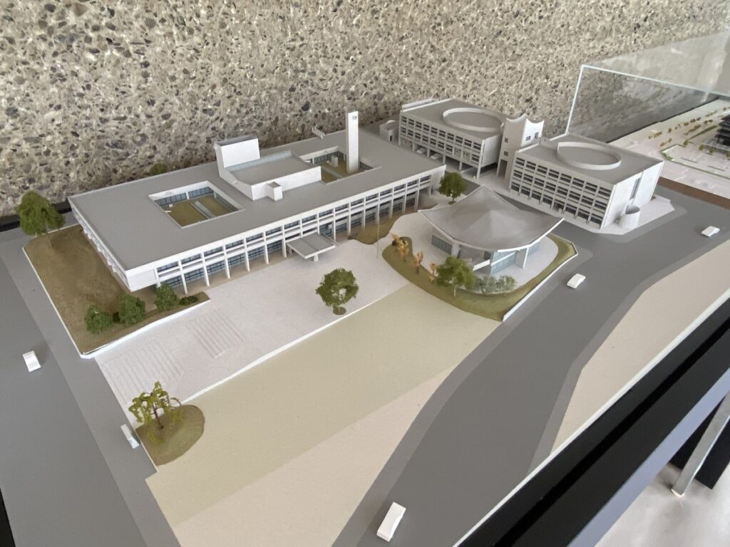 周辺には坂倉の設計で同時期に建てられた伊賀市北庁舎(旧三重県上野庁舎)や公民館があったが、ともに2012年度に解体されている。下の模型写真の右上が北庁舎、右下が公民館だ。
