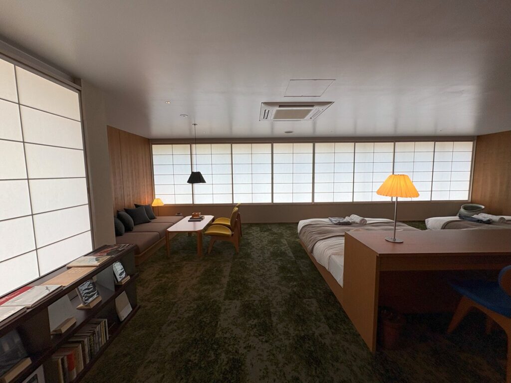 客室は、NOTA&design が手がけたインテリアスタイリングにより、温もりのある素材感と静けさに満ちた空間に仕上がっています。坂倉準三建築研究所が手がけた天童木工の家具や、当時の建築の雰囲気に調和する調度品が配され、空間全体に穏やかな調和が生まれます。視線が低く設計された空間は、外の賑やかさから離れ、心地よいプライベート感を演出します。NOTA&designは、客室を「生き物のように、時間とともに育まれる空間」と捉え、宿泊者の気配や流れが静かに深まるような設えを施しています。