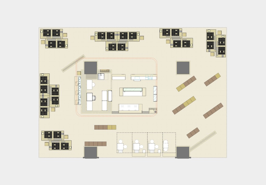 「本計画は、四方を通路に囲まれた特殊なテナント区画の特性を生かし、あえて『正面』をつくらず、全方向に開かれた店舗構成とした。受付を中心に据えたコア型プランにより、回遊性と発見性を生み、自然と人が引き込まれる空間を目指している。視野や色彩の効果を活用し、見る角度や歩く動線によって印象が変化する、感覚的で人間味のある体験をつくり出した。什器は全方向から見える開放的な構成とし、地域性や個性を織り込むことで、均質化しがちな多店舗展開の中でも独自性と愛着を育てるデザインとした。デザイン性とコスト、展開性の両立を図りながら、新しい店舗体験の可能性を提示している」(事務所コメント要約)