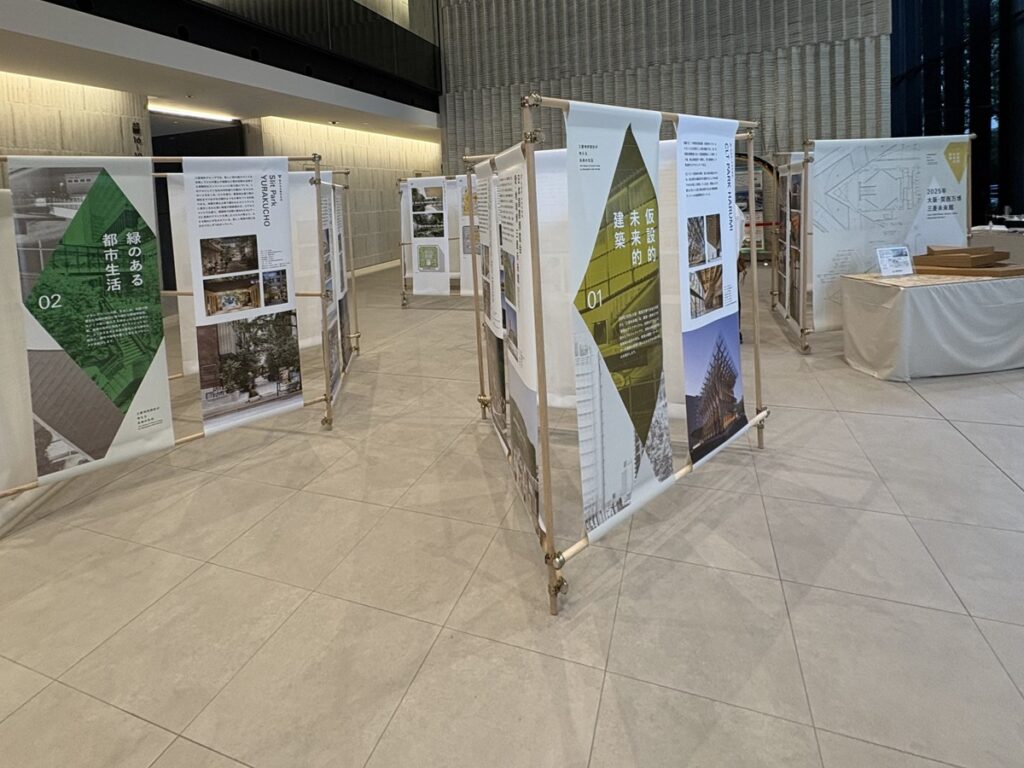 三菱地所設計のオフィスはOAPにあるが、他の事務所と近い「大阪堂島浜タワー」のエントランスホールで開催。エントランスホールなので、10時の開始前に行ってもやっているだろうと思ったら、やはりやっていた。今年は木造・木質系のプロジェクトを中心に展示。