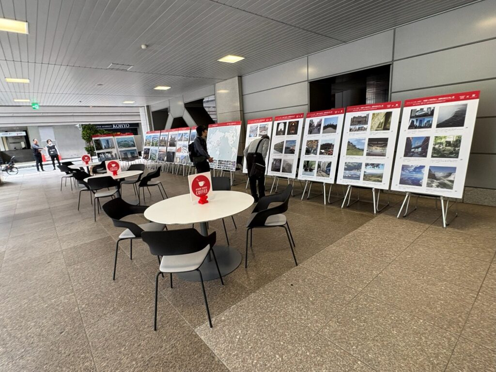 プロジェクトのパネル展示は、昨年と同様、ビルの足下のピロティにずらり。無料のコーヒーを飲みながら、見たり休んだりできる。ビル内ではワークショップ 「建築模型製作体験」を開催。