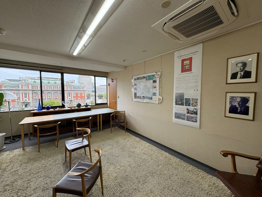 北浜の川沿いのビル(下の写真の中央)の4階にあるオフィスを公開。展示とともに、ゆったりした中之島周辺の景色を見せる。