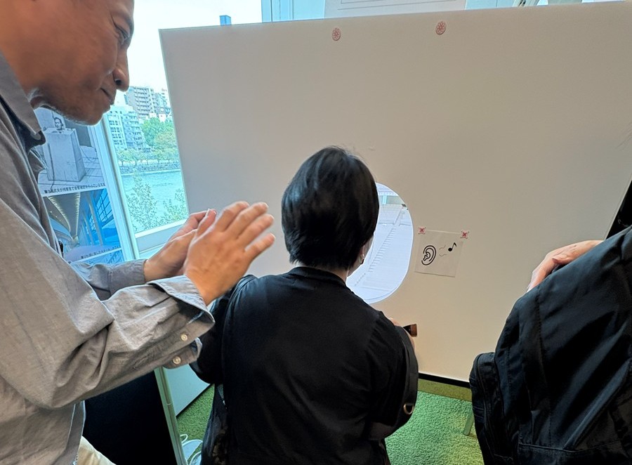 びわ湖ホールの音響を体験する箱に頭をつっこんだり…。と、いきなりチャレンジングな展示連発だったので、「敢闘賞」を贈呈。
