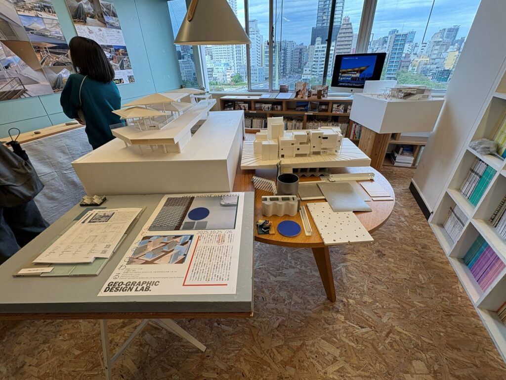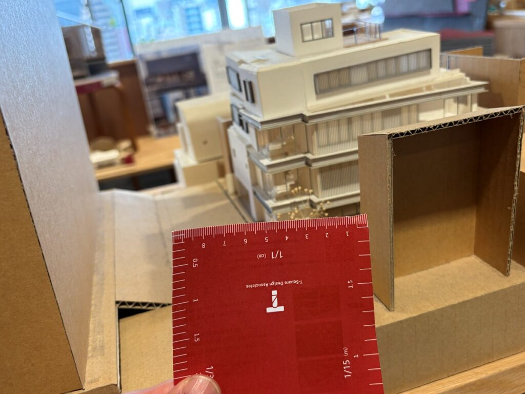 北浜の「GROW北浜ビル」には2つの参加事務所がある。まずは10階のティースクエアデザインアソシエイツ(代表:津田茂)へ。仕事場にそのまま模型などを展示するカジュアルな手法は昨年と同じ。今年は、模型から実寸を読み取るための四角スケールが無料配布された。