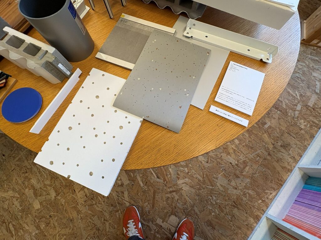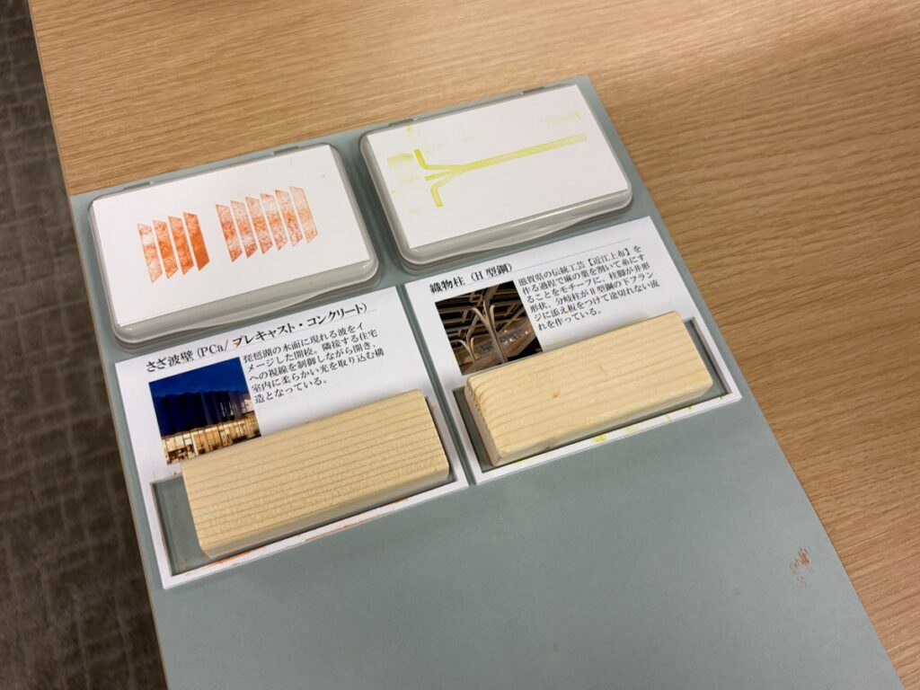 ティースクエアデザインアソシエイツから2フロア下りると、ジオ-グラフィック・デザイン・ラボ(代表:前田茂樹)だ。今年は、プロジェクトに実際に使われた素材を触ってみてください、という趣向。