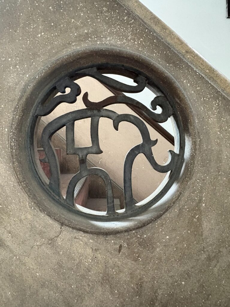 東本願寺と渉成園の間、前を通る誰もが目を惹かれる「重信会館」。昭和初期の建築らしいアールデコの特徴が味わえます。中央に入口、両脇に丸窓のある左右対称のつくりを基本としながら、右にある横長の線は正面から側面に回り込むなどスピード感を強調するデザイン。印象的な窓飾りや階段の意匠、蔦の絡まる外観、西洋と東洋が融合したエキゾチックな内部も見所
