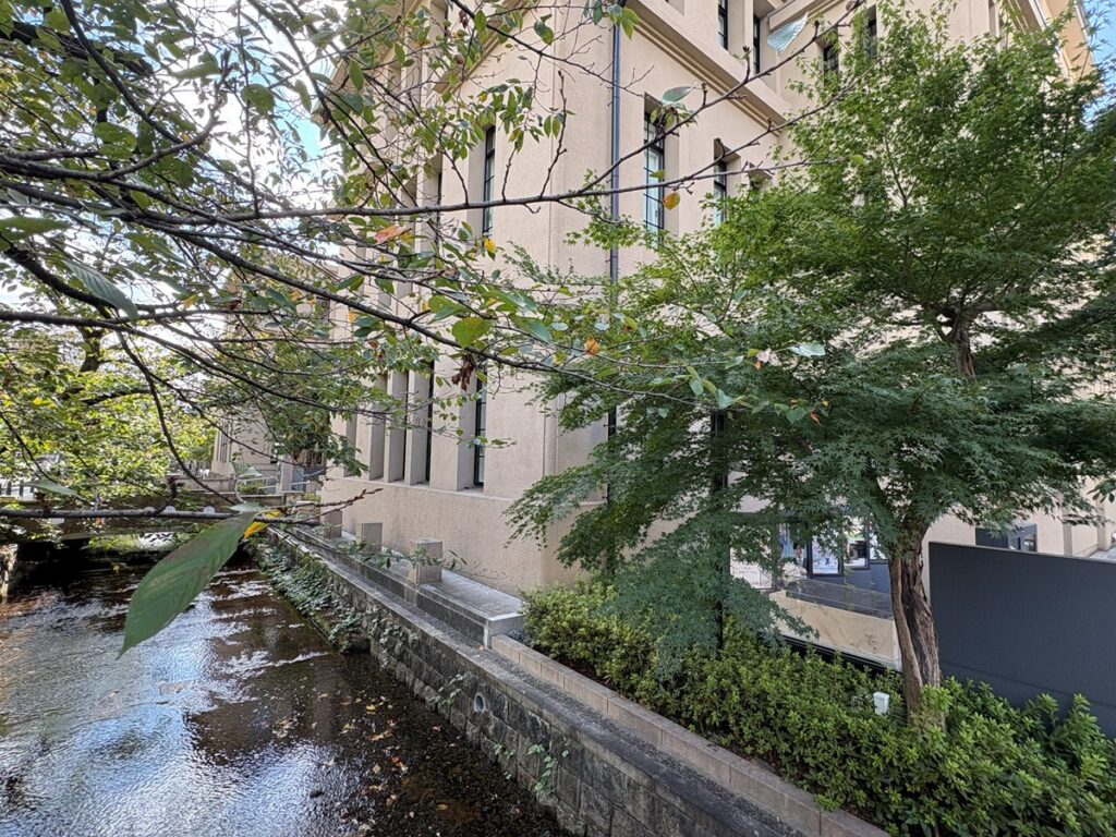 ザ・ゲートホテル京都高瀬川は、1928年に開校した元立誠小学校の校舎の一部を改修、増築した施設です。いまなお残る校舎は鉄筋コンクリート造で、正面には小さな半円アーチを備えた縦長窓が並ぶなどロマネスク様式風。そこに、水平線を強調する軒がつけられ、当時流行していたフランク・ロイド・ライトの影響を感じさせます。