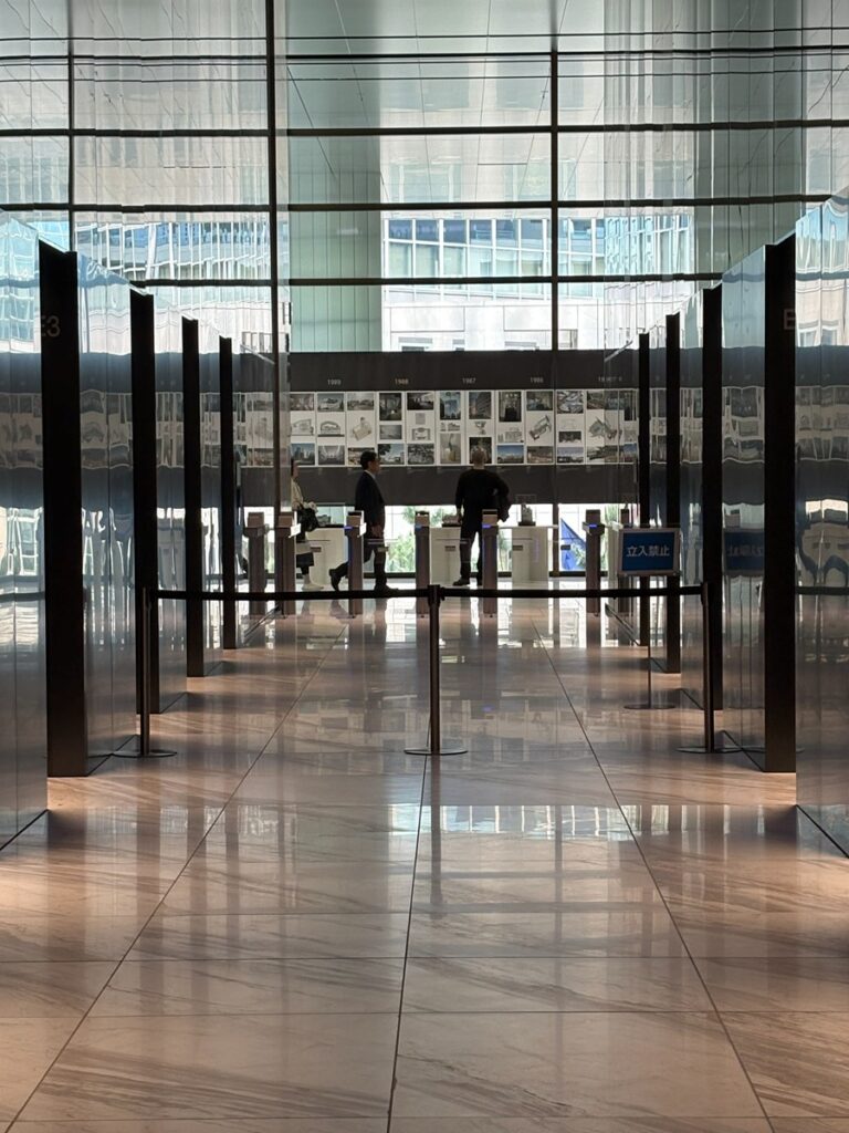 槇事務所が展覧会をやるとなれば、ギャラリーや美術館がどこでも会場を貸してくれそうに思う。が、あえて巨大オフィスビルの細長いロビー空間で、一般の人に見せることを選んだわけだ。おそらく、仕切られた部屋でやる方が準備(展示の下地やら照明やら)も簡単なはず。この空間の今後の使い方提案を含めての展示なのだろう。