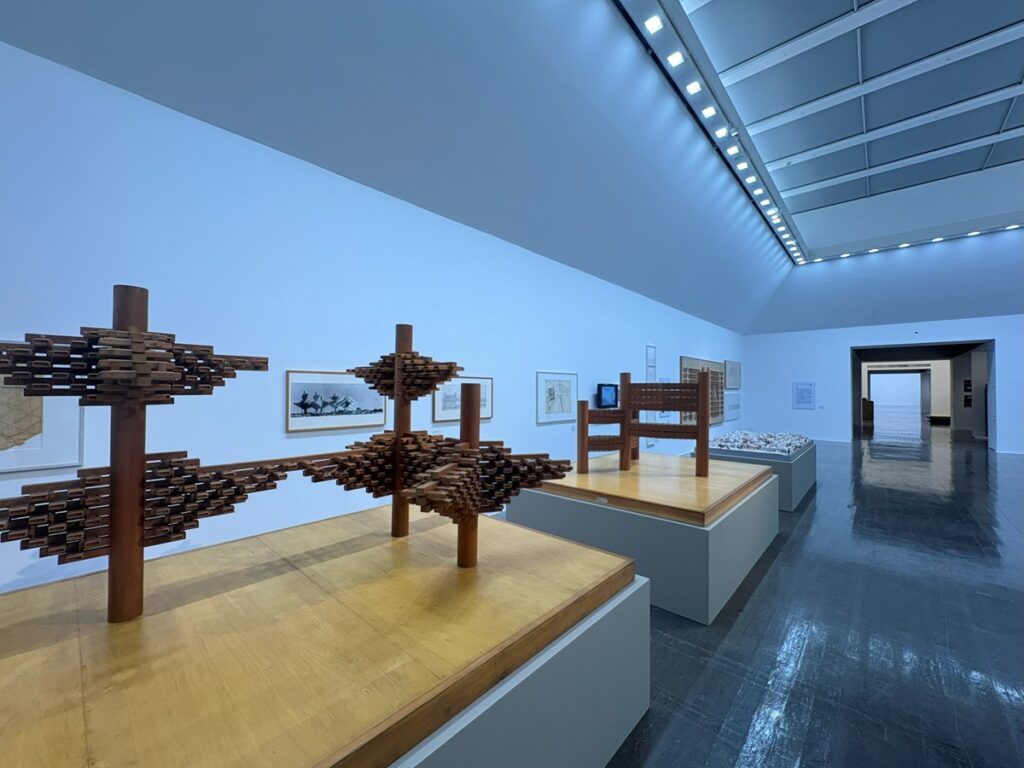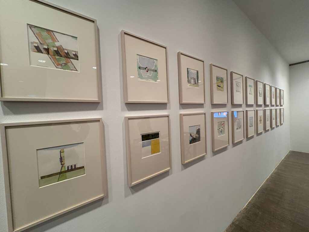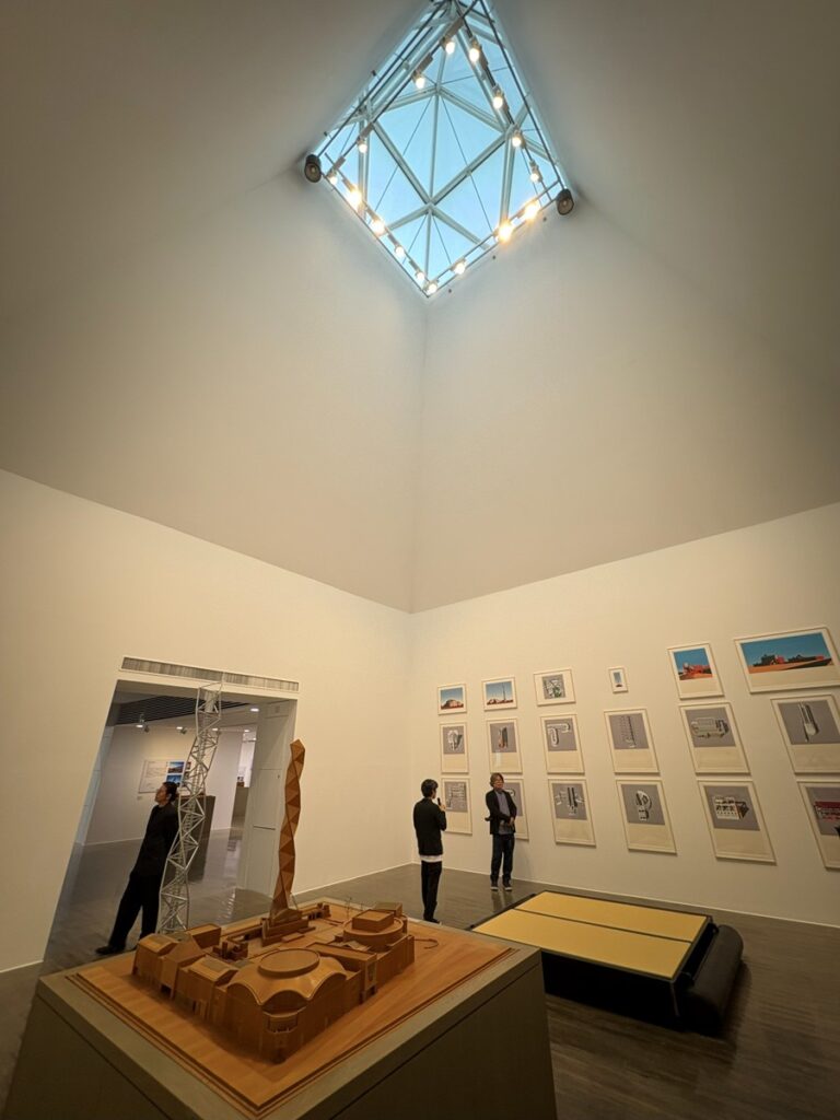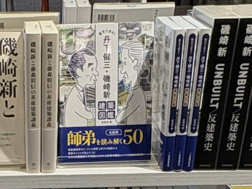 内容を紹介する前に、お礼から。会場の「現代美術ギャラリー」は2階にあるが、そこに上がる階段近くのショップに、拙著『画文で巡る! 丹下健三・磯崎新 建築図鑑』(画・文:宮沢洋/2025年3月/総合資格刊)が置いてあった! しかも入り口の一番いいところに!