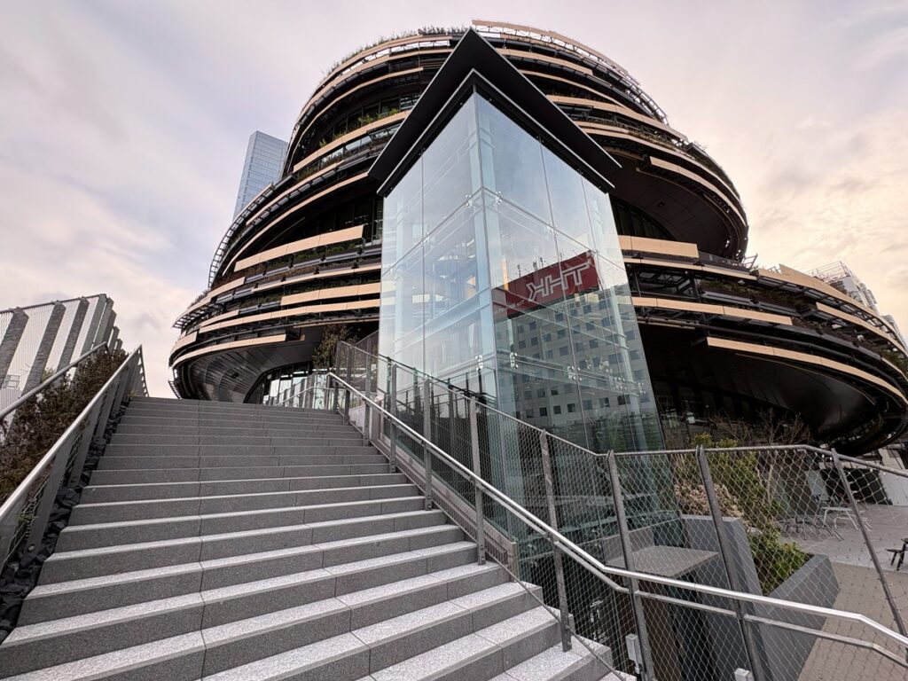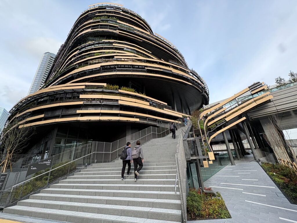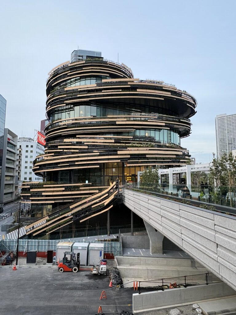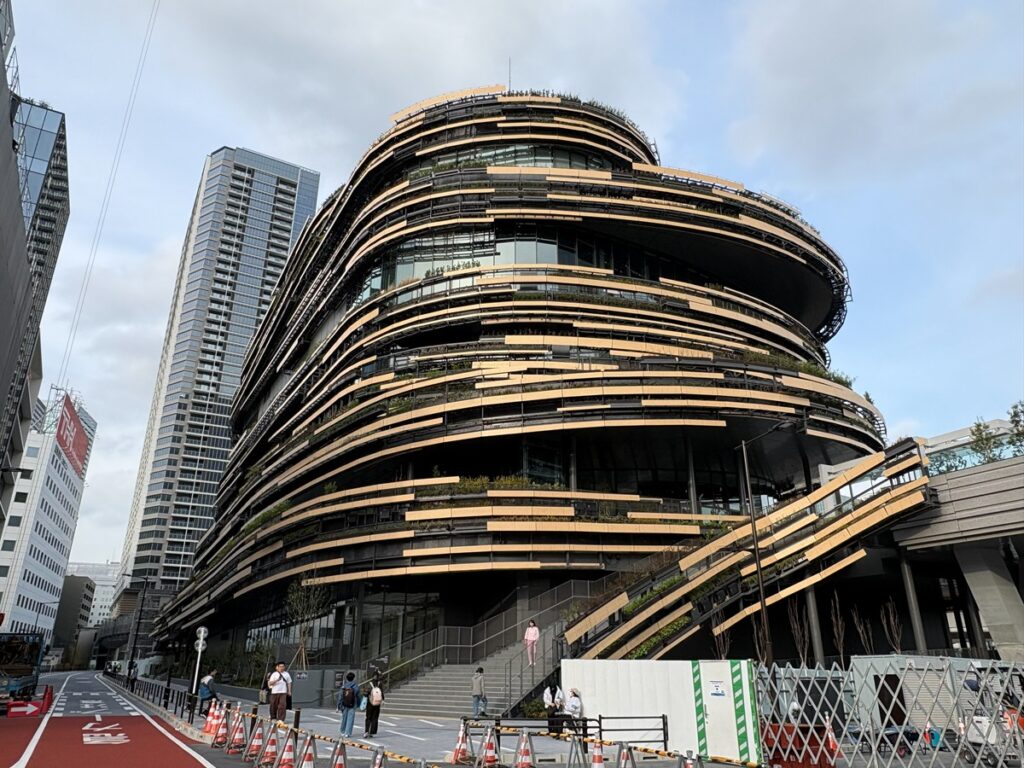 MoN Takanawaの外観はオーストラリアのシドニーに立つ「The Exchange」(2019年、写真を見たい方はこちら)に似ているが、あちらはアコヤ材(ラジアタパインなどをアセチル化処理した高耐久木材)を曲げたものをパネル化して、渦状に見せている。一見、らせんに見える。が、平面図を見ると、各階のずれとアコヤ材の傾きでそう見えるだけのようだ。
