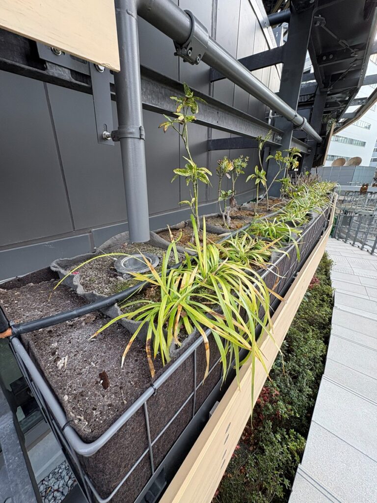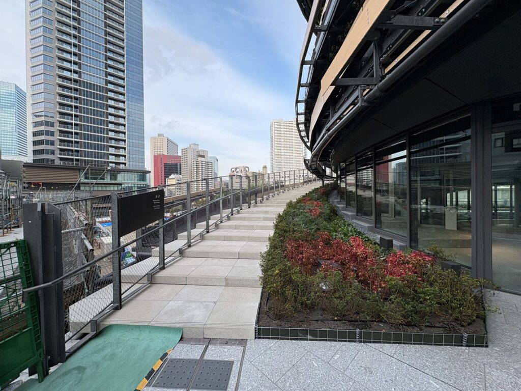 対してMoN Takanawaは、外装のぐるぐるが実際に上っていく。かつ木材(アコヤ材)と植栽ボックスのミックスだ。