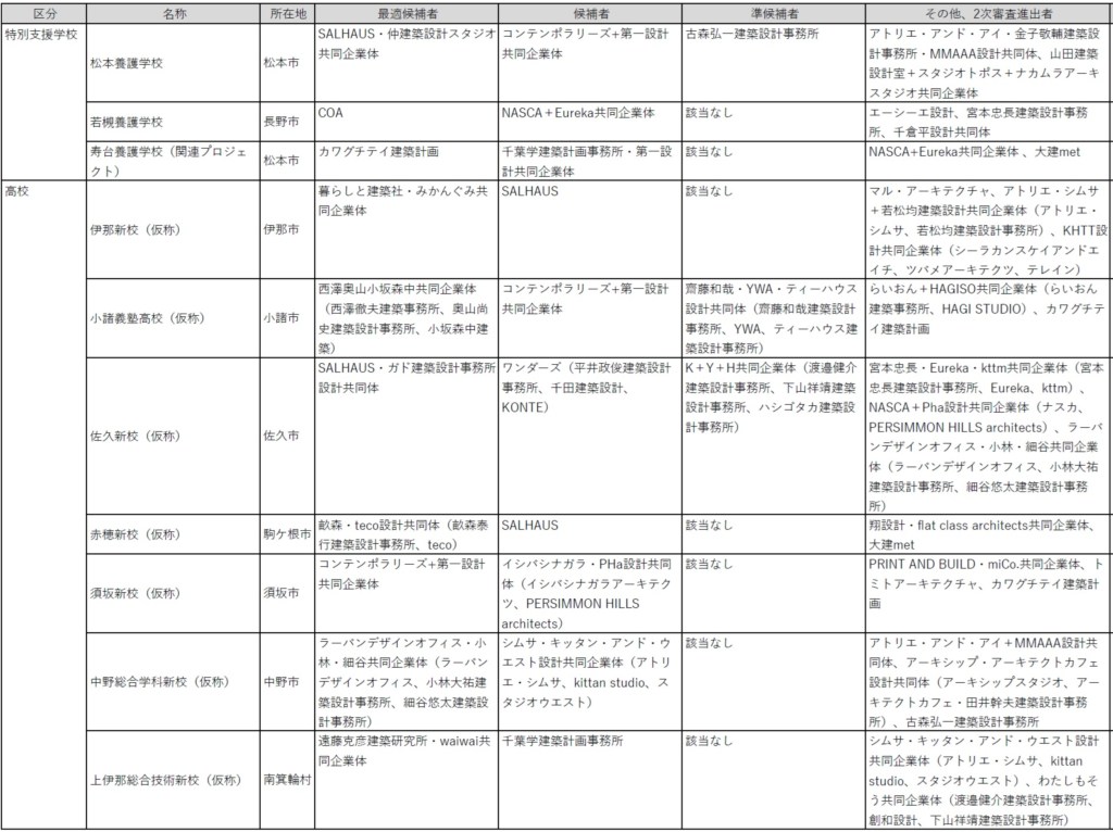 - 長野県の佐久新校はSALHAUS・ガド建築設計事務所JVに、赤穂総合学科新校は畝森・tecoJVがSALHAUSを抑える