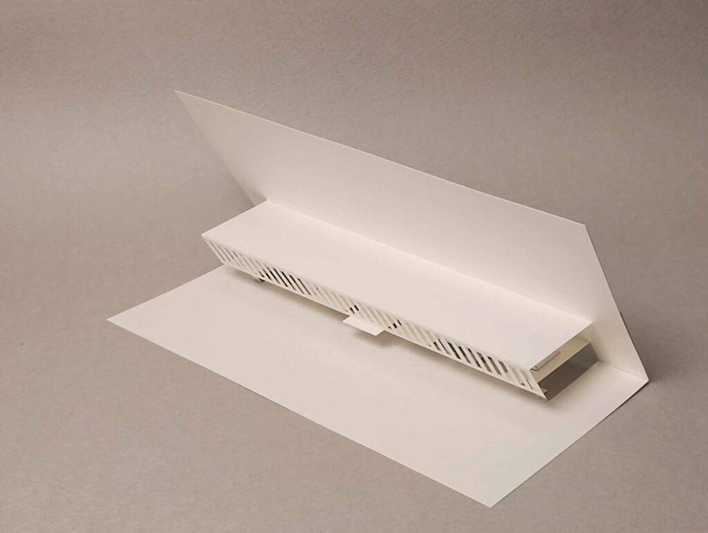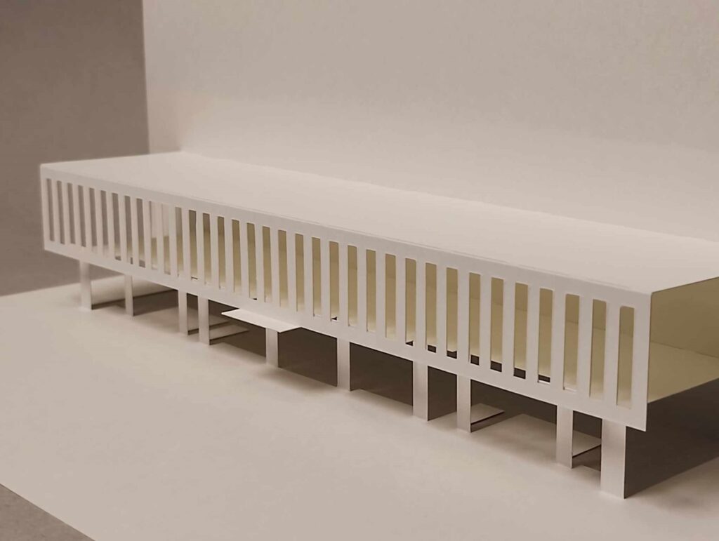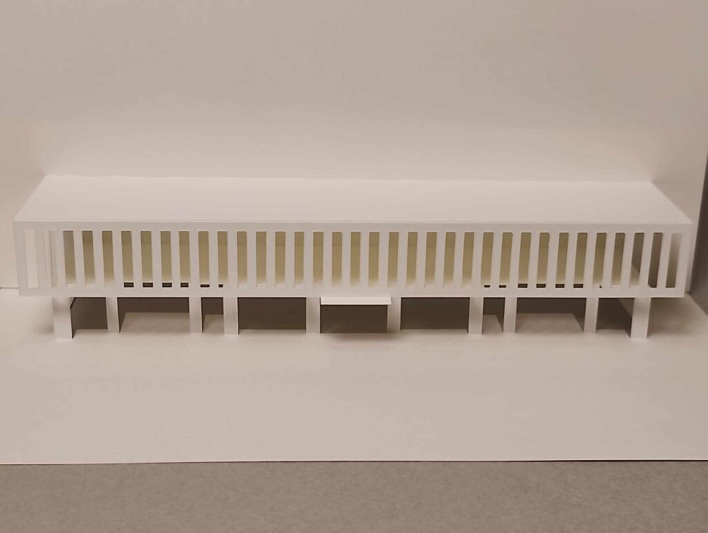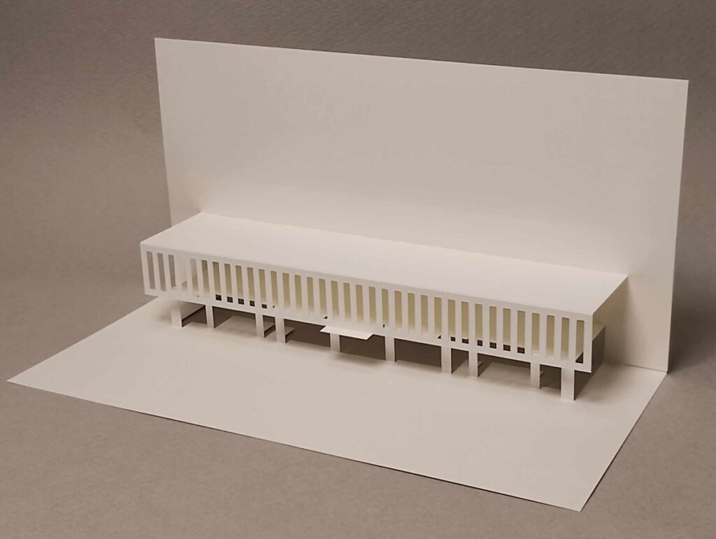 折り紙建築の制作ポイント:1階ピロティの列柱は忠実に配置した割には目立ちませんでしたが、ブリーズソレイユのピッチは紙加工の都合でかなり省略した割にそれなりの雰囲気を表すことができました。(五十嵐暁浩)