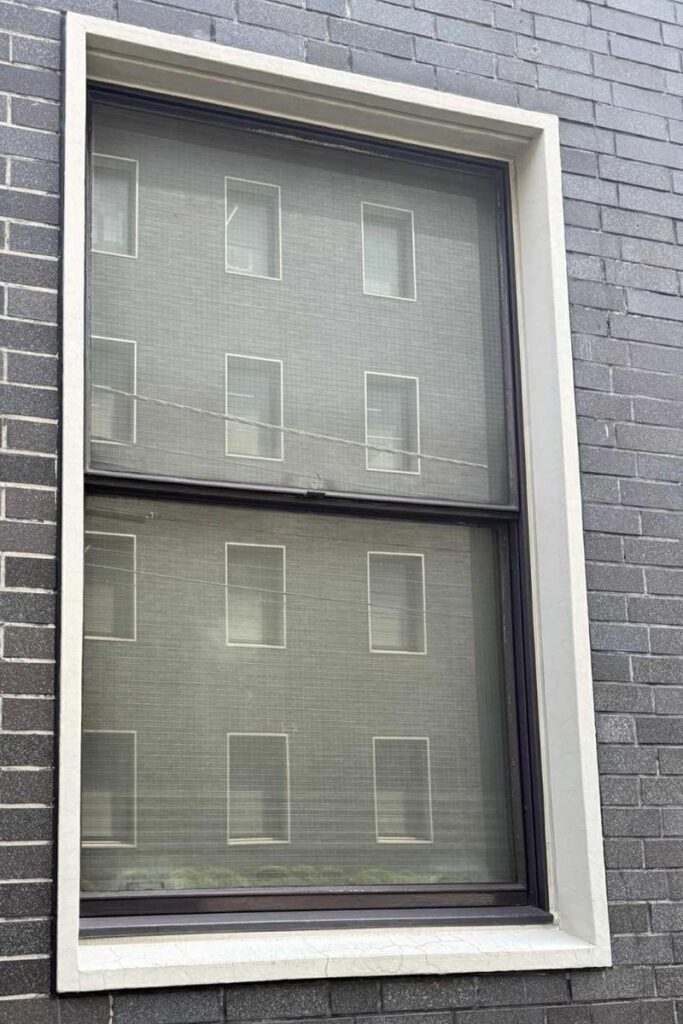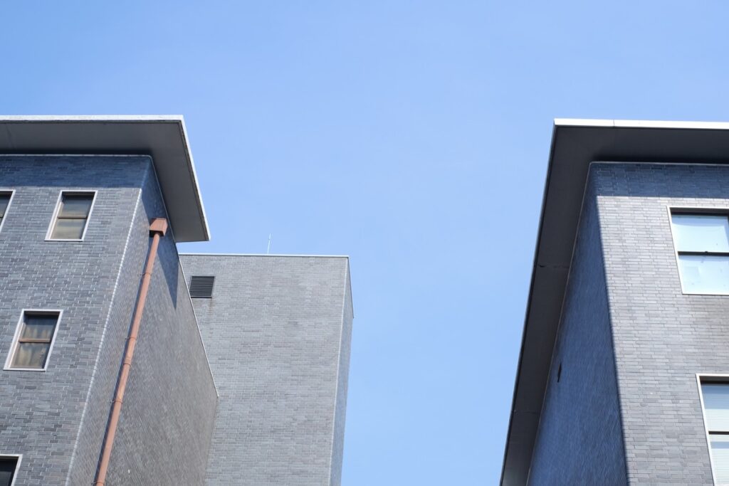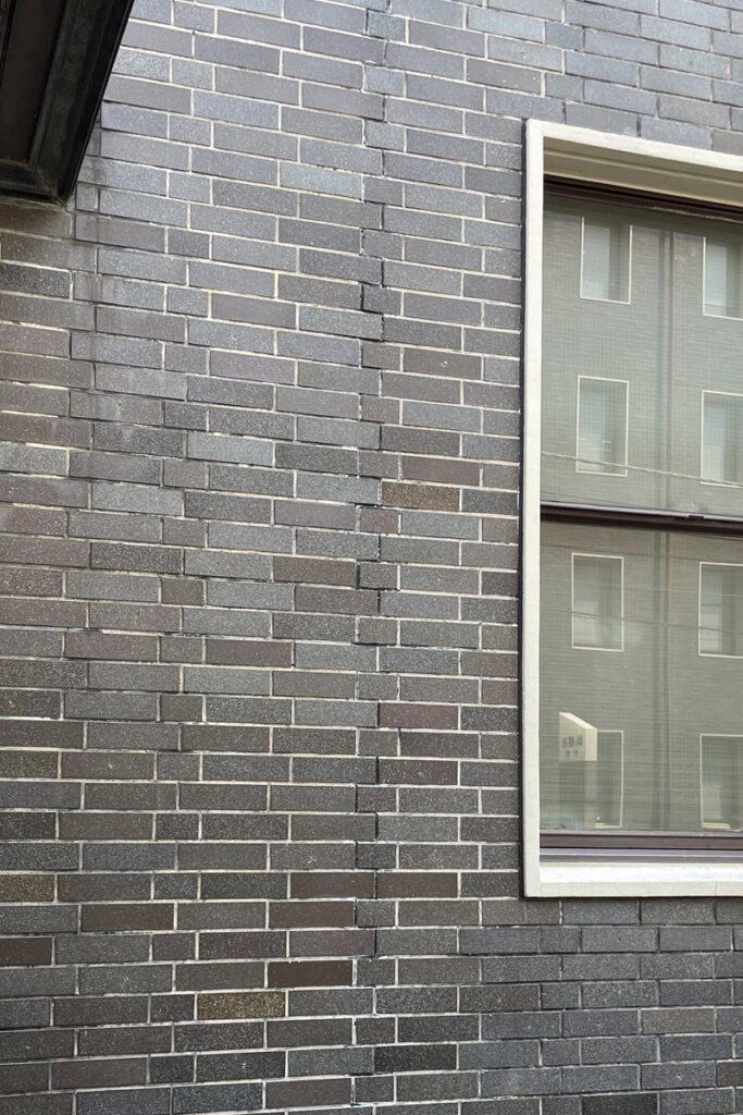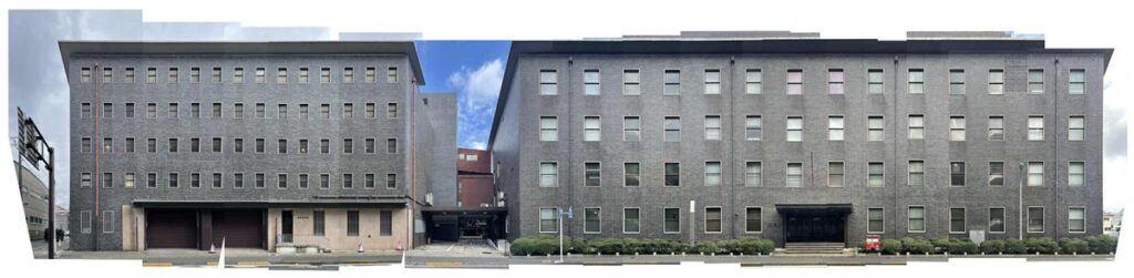 本館と別館に至っては、幅約43メートル高さ約16メートルの接道面に約1.3メートル×2メートルの14の窓が並ぶ立面構成が、ぴったりと一致するように向かい合っている。窓と壁の幅の比率はだいたい1:1.5で反復しており、独立窓と言っても壁勝ちの固い印象はない。