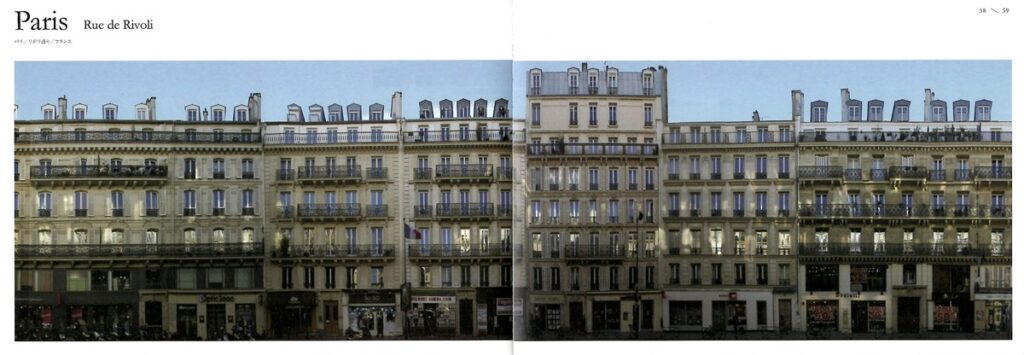 塚本研究室で編集した『WindowScape2ー窓と街並みの系譜学ー』によればブルージュ(ベルギー)のマルクト広場におけるギルドハウスのファサードは、壁より窓の割合が大きく、縦長のフレンチウィンドウが特徴的なパリのアパルトマンではおおよそ1:1になる。窓の密なファサードが反復する街並みに対し、新潮社ビルのプロポーションや窓と壁の比率は、どちらかというとイタリア・ルネッサンス期に確立した都市型建築のパラッツォに近い。組積造の構造的制限の中で縦長の窓が反復するパラッツォのファサードは、基部・胴部・頂部の三層に分節され、コーニスやロッジア、バルコニー、オーダー、ストリングコースといった建築要素や石材の配置、仕上げの操作によって三層の間にオーダー(秩序)が現れる。