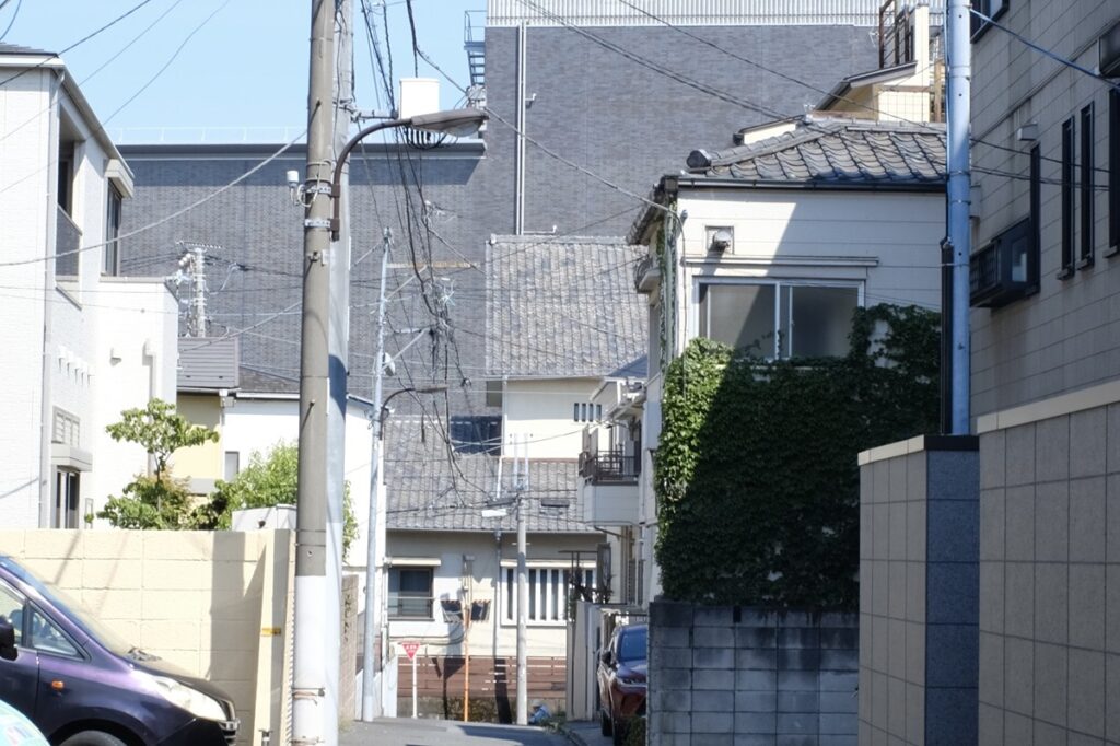 見学が終わり、脇の通りに入ってみると、矢来能楽堂のせり上がる瓦屋根越しに新潮社別館が見えた。瓦屋根の背景にタイルが馴染み、瓦屋根が多かったであろうかつての街並みとの調和が考慮されていたと想像できる。戦前の旧社屋は当時最先端であった鉄筋コンクリート現しのすっきりとした見た目だったことを考えると、瓦屋根の色味や質感といった当時まだ日本人に馴染みのあった街並みのイメージが投影された新社屋は、なかなか渋い選択だ。
