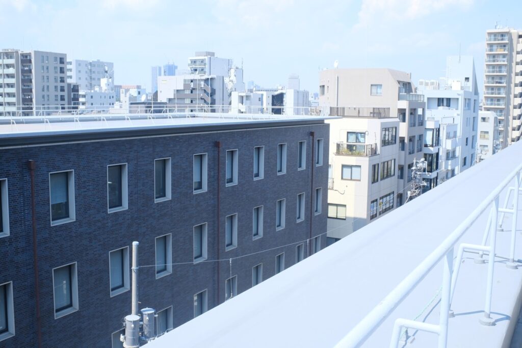 ランチの後は本館にある編集部や会議室、資料室を見学させてもらいながら、屋上へ向かった。階段を上がりきり、ペントハウスから外に出ると、東の空が大きく開け、風が気持ちよい。遠くに飯田橋のビル群が見え、新潮社がこの辺りで一番高いところに建っているのが分かる。振り返るとペントハウスに外壁と同じタイルが。屋上設備が納められたペントハウス壁もタイルで仕上げられ、窓と同一プロポーションの開口部にはテーパーがかかる。つまり屋上から至近距離で見られることが想定されていたのだ。しかし近年の大型化した室外機は、もうここには収まらず、屋上中央を占拠していた。眺めの良い屋上だけに残念に思った。