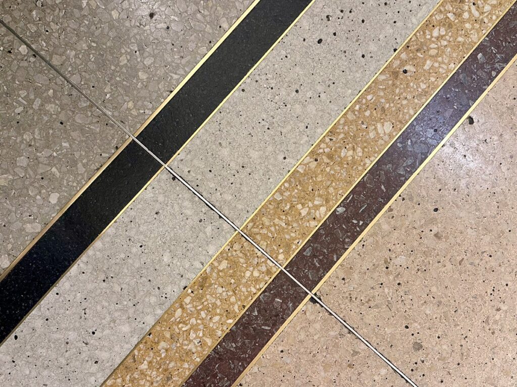 しかし、これまで指摘してきたように、杉山の手掛けた建築には、その空間の名脇役とでもいうべき曲面を伴う階段の意匠に特徴があった。「大手町ビルヂング」にとっても階段は、目立たないところに配されていて、空間の主役たりえてはいない。改修後の姿が掲載された雑誌([4][5][6])等でも階段室は取り上げられていない。しかし、ここでも階段がアツいはずである。そう思って、現存する階段室へと向かった。ここにもやはり、名脇役としての階段があった。滑らかな曲線で折り返されたトラバーチン仕上げの階段が、鈍く密やかに輝いていた。