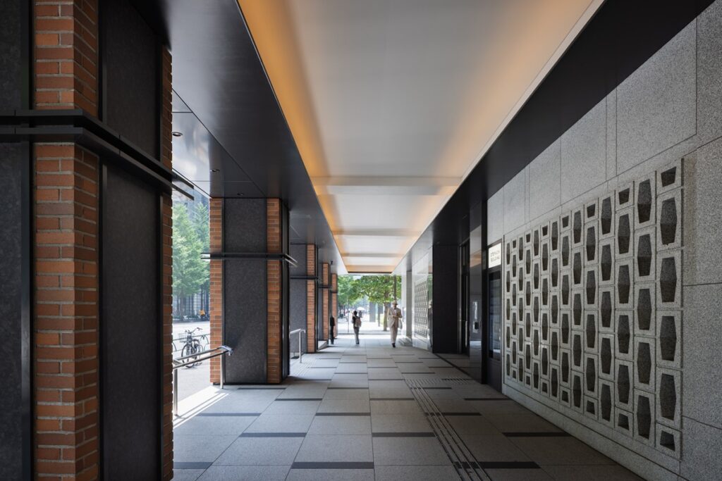 レンガの街の面影を宿した東京駅のある東側(大名小路側)は、レンガ調のGRC(ガラス繊維補強コンクリート)パネルで、皇居の石垣が堀に映える西側(日比谷通り側)は、石垣調のGRCパネルでそれぞれ仕上げ、周辺環境と呼応した風景を創出している。丸の内から大手町へと通る仲通りが貫通する建物中央部は透明なガラス素材で仕上げ、内部の通路と仲通りとの連続性を演出している。