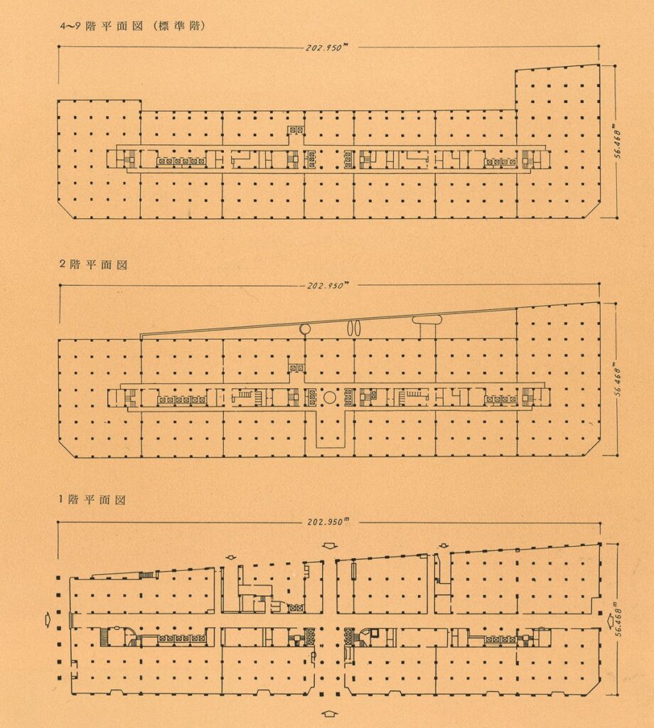 第二次世界大戦の終結から10年、日本はかつてないほどの急速な経済成長に沸いていた。それを下支えしたのは、勤勉で緻密な仕事を好み、集団で協調する精神をもった国民性であったなどと言われる。しかし、ここではあえて、そんな人々を会させる職場空間の充実もまた、好景気を後押ししたことに想いを馳せたい。「もはや戦後でない」との流行語を伴った更なる好景気への期待感から、働く意欲が都心に溢れ、事務所ビルの需要も拡大していったのであった。