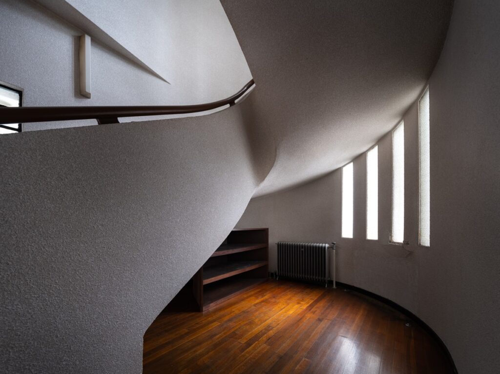 この細い双子の開口を見て、筆者はすぐさま「赤星鉄馬邸」(第2回)の階段を想起した。赤星邸の階段にも、まさに連続する縦長の開口部が曲面に穿たれ、そこから注ぐ光が曲面壁と階段の裏側に彩りを添えていた。
