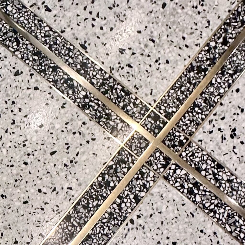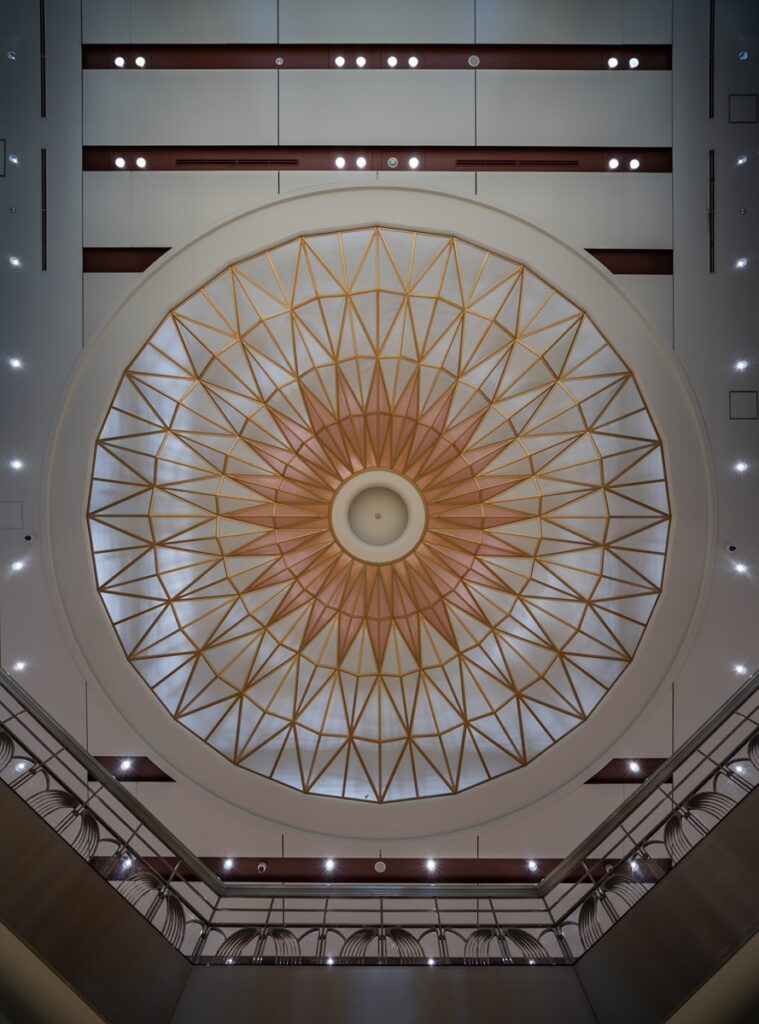 さらに、実際に訪れると、玄関ホールの柱には隅切がなされ、そこに砕いたタイルに金箔を貼ったような格調高い化粧を付加していたり(写真17)、エレベーター周りの石壁に矢橋六郎作のモザイク画「彩雲流れ」をはめ込んだ立面を現したり(写真18)、床を様々な模様と色味のタイルや人研ぎで仕上げていたり(写真19)、中央ホール上部に幾何学的な天窓兼用照明を仕込んでいたり(写真20)、2階ギャラリー部分にアール・ヌーヴォ調の手すりを設えたりと(写真22)、図面からは決して読み取れない手仕事性に溢れる素材感豊かな工芸美が味わえる(これらは全て、オリジナルが残されている)。