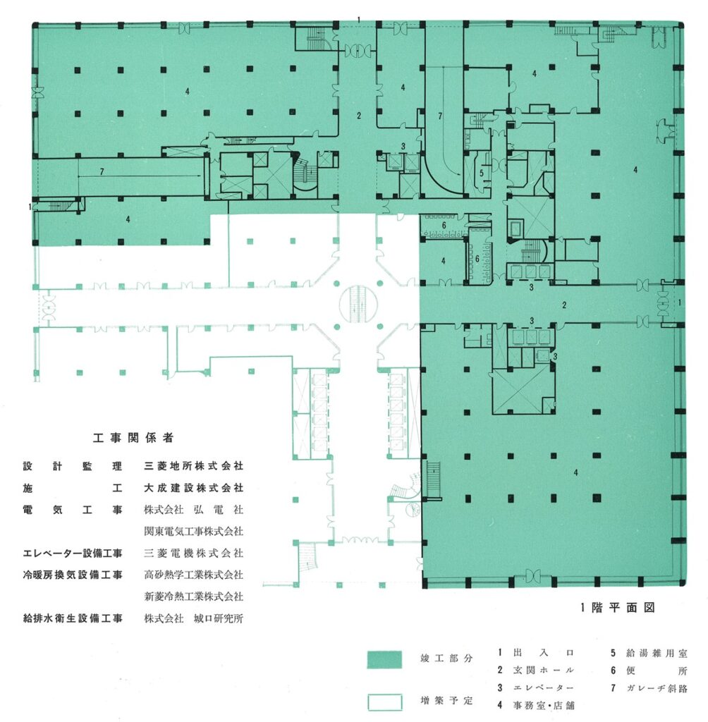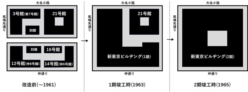 このうち、テナント移転の都合により2期工事となった「第21号館」以外の3つを、1961年8月より順次解体。同年11月に地鎮祭が行われ、1963年6月にL字型の第1期が竣工する。同年9月から残されていた「第21号館」を取り壊し、敷地を統合し(中央の細い通りは、第1期分との接続も行われたうえで、丸ごと1つの街区として1965年4月に完成した([5]p.110-111参照)。この3段階のプロセスを図に整理するとこのようになる(図05)。