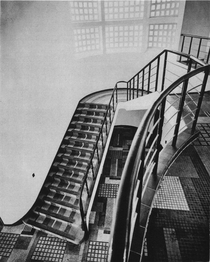これまでみた杉山の作品では、とくに階段の意匠に特徴があった。「新東京ビルヂング」もまた、階段が魅力的な建築である。