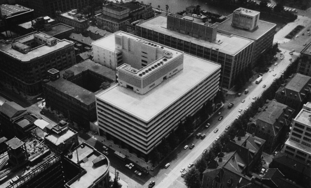 そして、1965年4月、「新東京ビルヂング」は隣接した「第21号館」の敷地と一体化するかたちで増築され、L字型から真四角の整形な平面となり、総坪数32,066坪(106,004㎡)の巨大なオフィスビルが完成した。