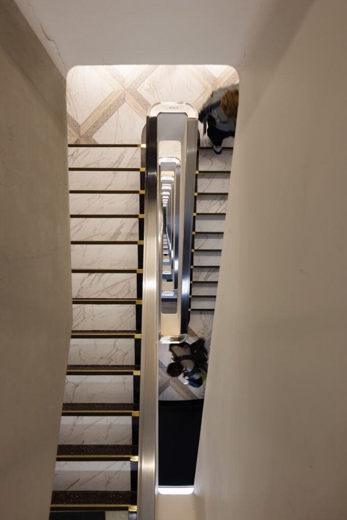 「新東京ビルヂング」がさらに興味深いのは、この折り返し階段の手すりが、下から上まで一本ものとしてつながっていることである。外側と内側から壁厚中央に向かって下がった扁平のMの字型断面形状のステンレスの手すりが、継ぎ目なく滑らかに連続しているのである。