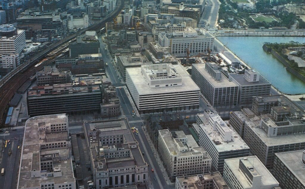 ちなみに、同年(1965年)11月には、線路の向こう側の常盤橋街区に「日本ビルヂング」が延床面積約5万坪で竣工している(注1)。こちらの設計を担ったのも杉山であった。「大手町ビルヂング」、「新東京ビルヂング」を凌いで「日本ビルヂング」が丸の内最大となった。こうして、「丸ノ内ビジネスセンター」の三大拠点が完成をみる(注2)。