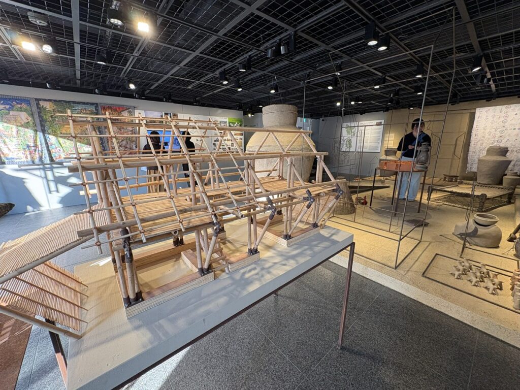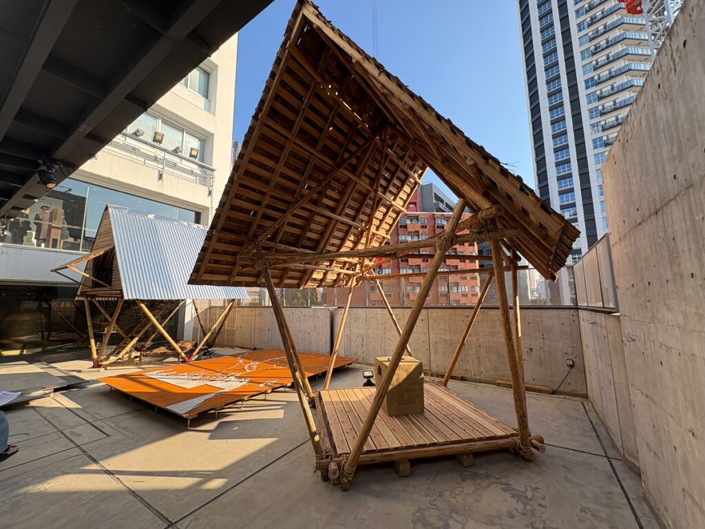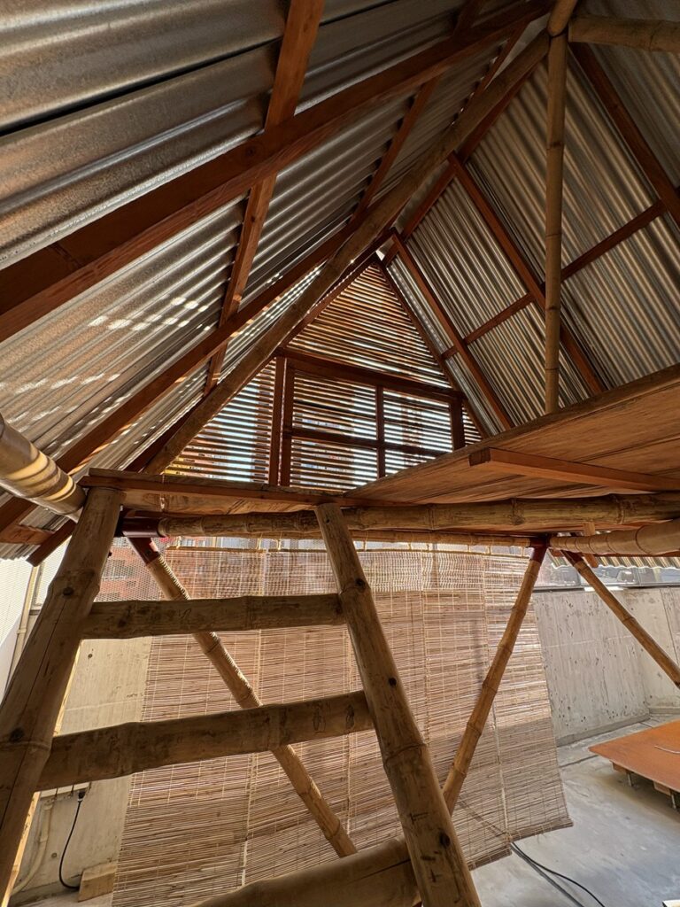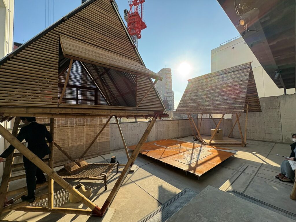中庭はMTAオリジナルの「クディ・バリ」をバングラデシュから輸送し立ち上げるとともに、京都の里山で実践を行う建築家の森田一弥氏と京都府立大学森田研究室協力のもと、日本の素材と技術で翻案した「日本版クディ・バリ」を新たに制作し、展示します。