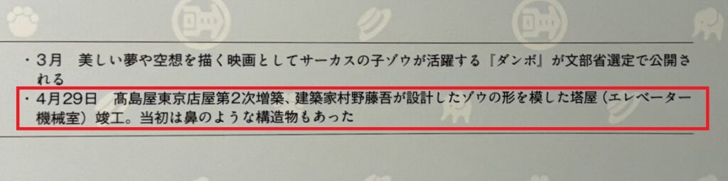 2つ目は、村野が象の塔屋を建てた後に高子の寄贈(上の動物園行き)が決まったということ。塔屋の完成も1954年なので、筆者はこれまで、「村野は象の高子の思い出として、屋上に象の背中を思わせる塔屋を建てた」と書いてきた。これは間違いだったかもしれない。