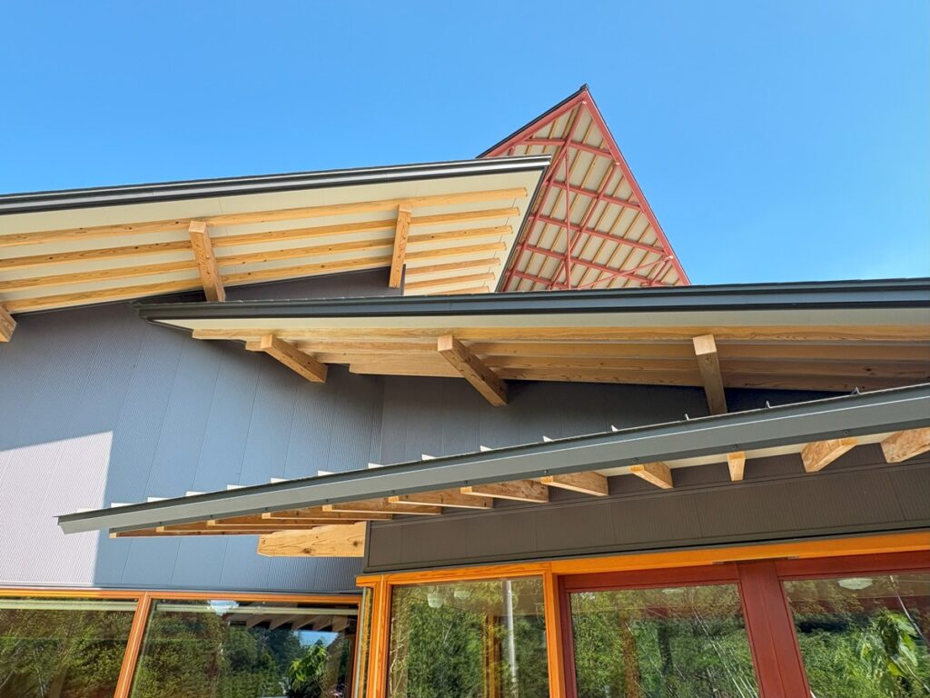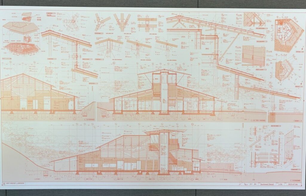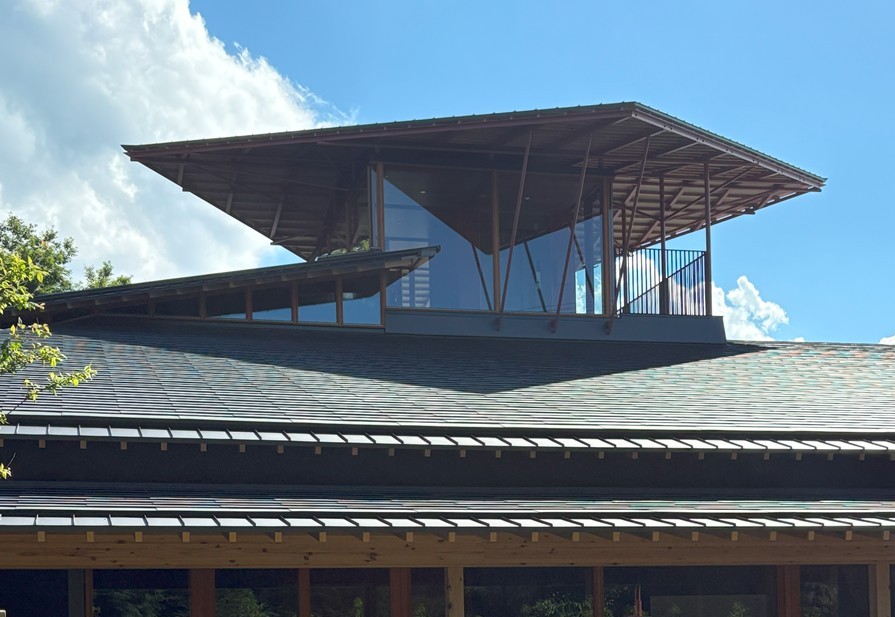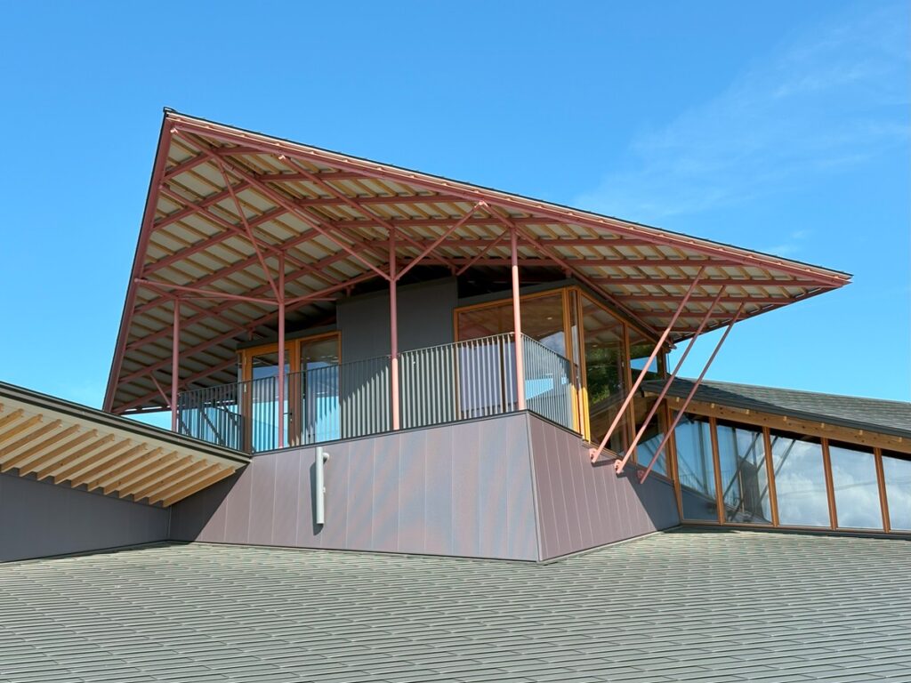 青鬼:この展望テラスの形状は、屋根の折り重なりから決めたんだけど、構造的には難易度が高かったので、この部分だけスチールにした。風にあおられるので、木でやったらとてももたない。ここの本体でやろうとしたのは、木の在来工法を使ってどこまで動きのある空間をつくることができるか。