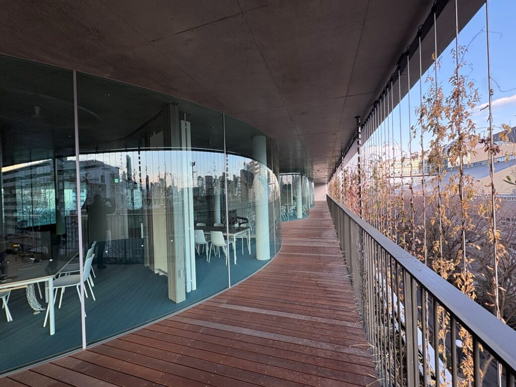 今回の計画では、その既存52号館を含む低層教室階と高層研究室階の間に「パークフロア」と名付けた開放的で緑にあふれた空間を配置しました。ここにカフェテリアやラーニングコモンズを設けました。この「パークフロア」で学生、教職員がくつろぎ、議論し、知が育まれる場所になればと願っております。田中総長先生が「文理横断」ということを強く仰っておられますが、この空間が様々な意味での「横断」に寄与することになればと思います。
