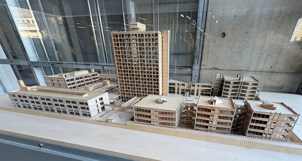 その第一期となるのが、「52・53・54号館建替工事」で、2020年に指名プロポーザルで選ばれた日建設計が設計を担当している。2023年9月に着工。工期は約5年で、2028年11月頃に完成の予定だ。先行して工事を進めていた西端の52号館は今年4月から利用を開始する(研究室などはすでに使用している)。1つの節目ということで、プロポーザル時の中心となった亀井忠夫会長と、実施段階の中心となっている設計部門設計グループダイレクターの團野浩太郎氏に案内してもらった。