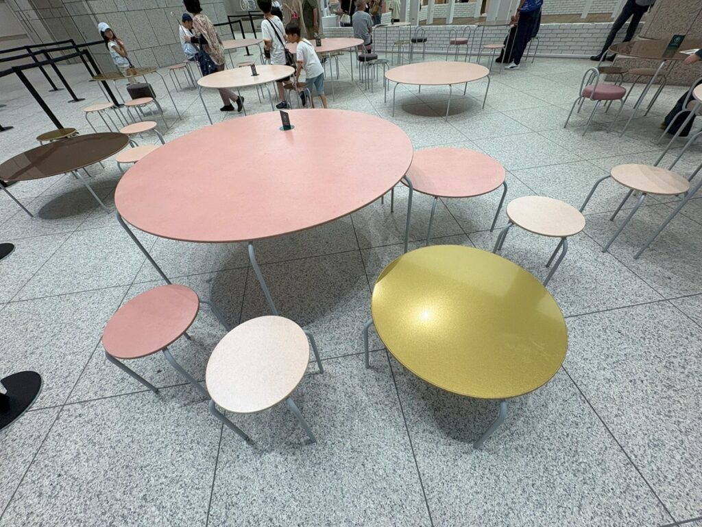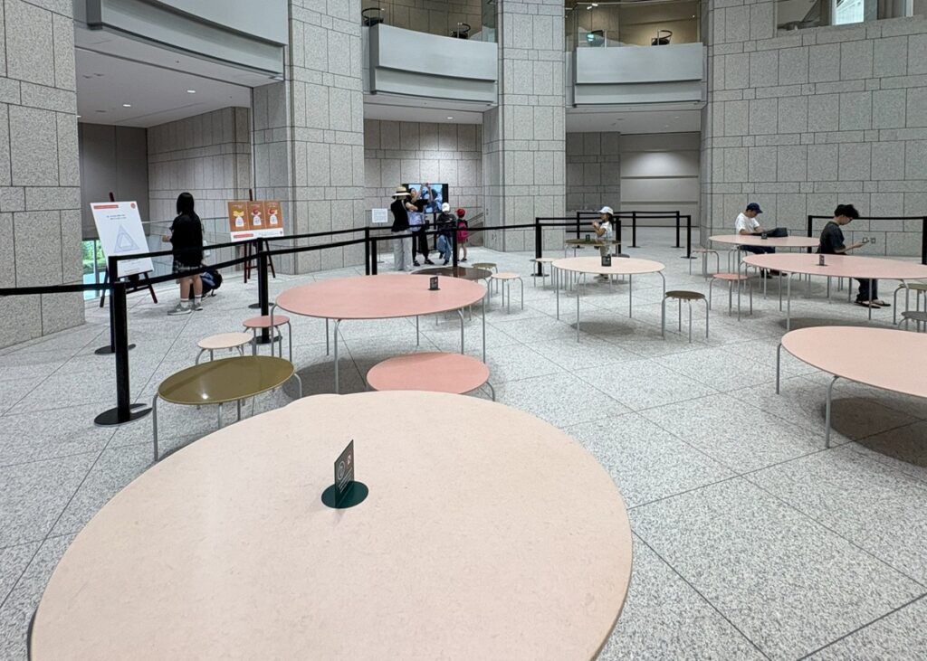 正確に言うと、建物に使われている石から11色を取り出して家具類を構成している。また、乾氏と菊地氏は、什器やサインをデザインするにあたり2日間のインクルーシブワークショップを実施。視覚障害(全盲/弱視)・聴覚障害、高齢者、親子など多様な背景をもつ20人以上に意見を聞いたそう。(詳細は美術館のサイトのこちらのページへ)