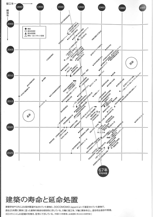 日本建築学会やJIAによる保存要望書が出されていた建物と、DOCOMOMO Japanによって選定されていた建物で、過去25年間に解体に至った建物の寿命を相対的に示している。X軸が竣工年、Y軸が解体年。